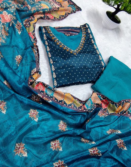 Teal Blue Mul Crepe Embroidered Straight Kurta Set with Pant & Dupatta