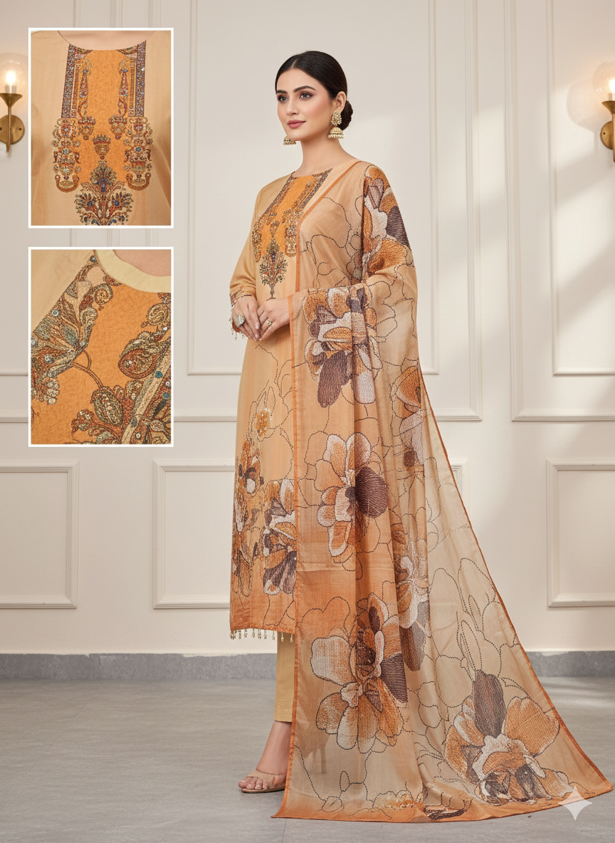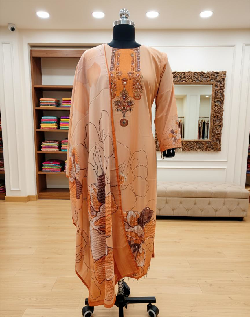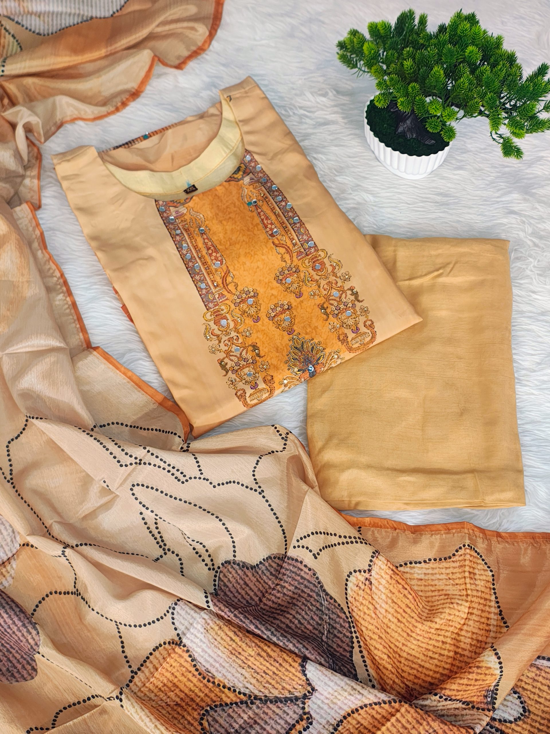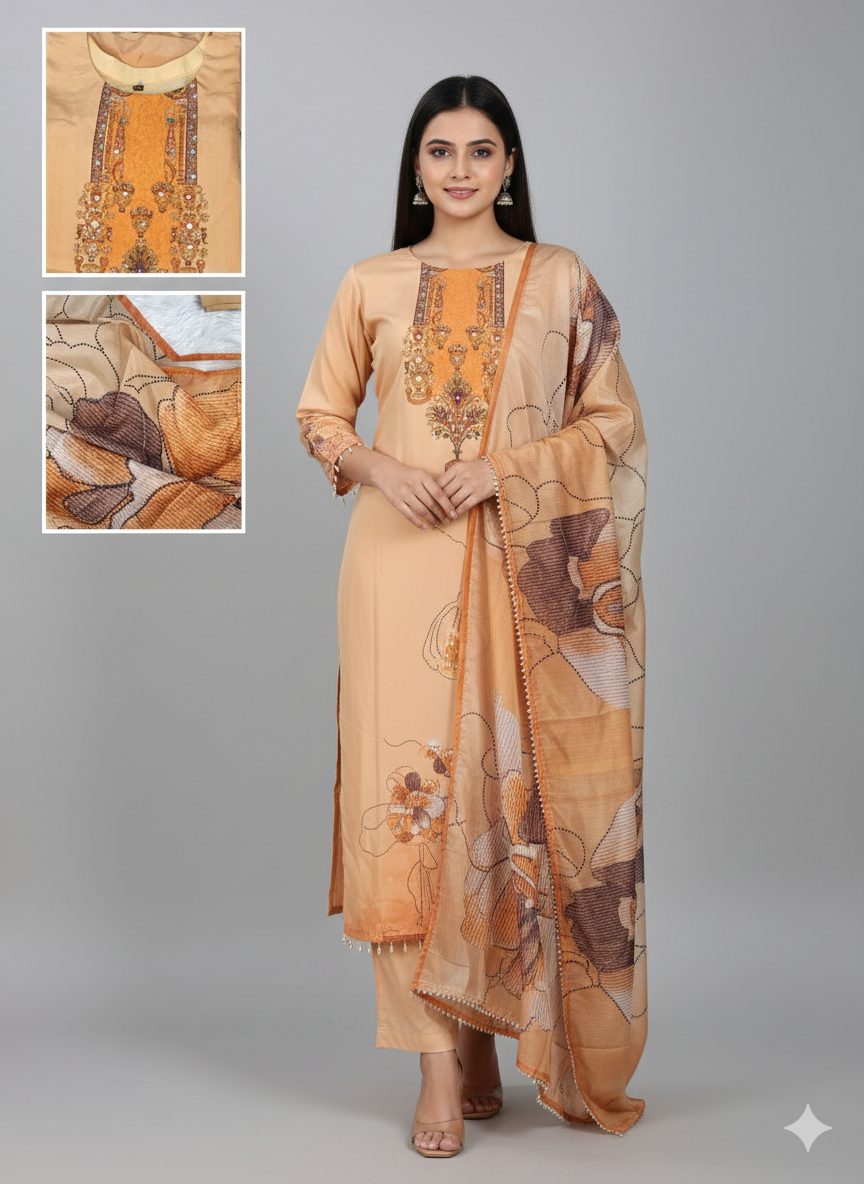The neutral beige tone is delicately highlighted with mirror work detailing, adding subtle sparkle and handcrafted charm while keeping the look refined and understated. The straight-cut silhouette provides a flattering and versatile fit, perfect for both casual and semi-formal occasions. Designed as a coordinated set, this kurta ensemble delivers a polished and well-balanced ethnic look.