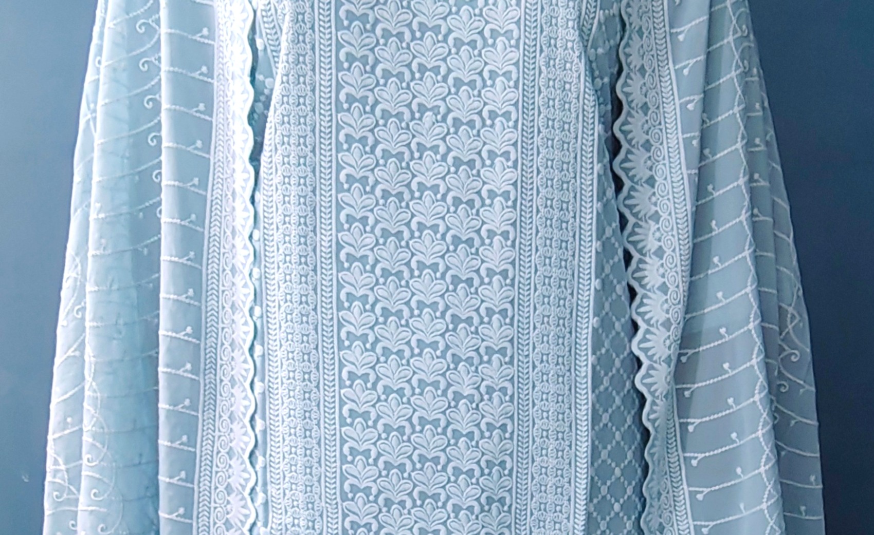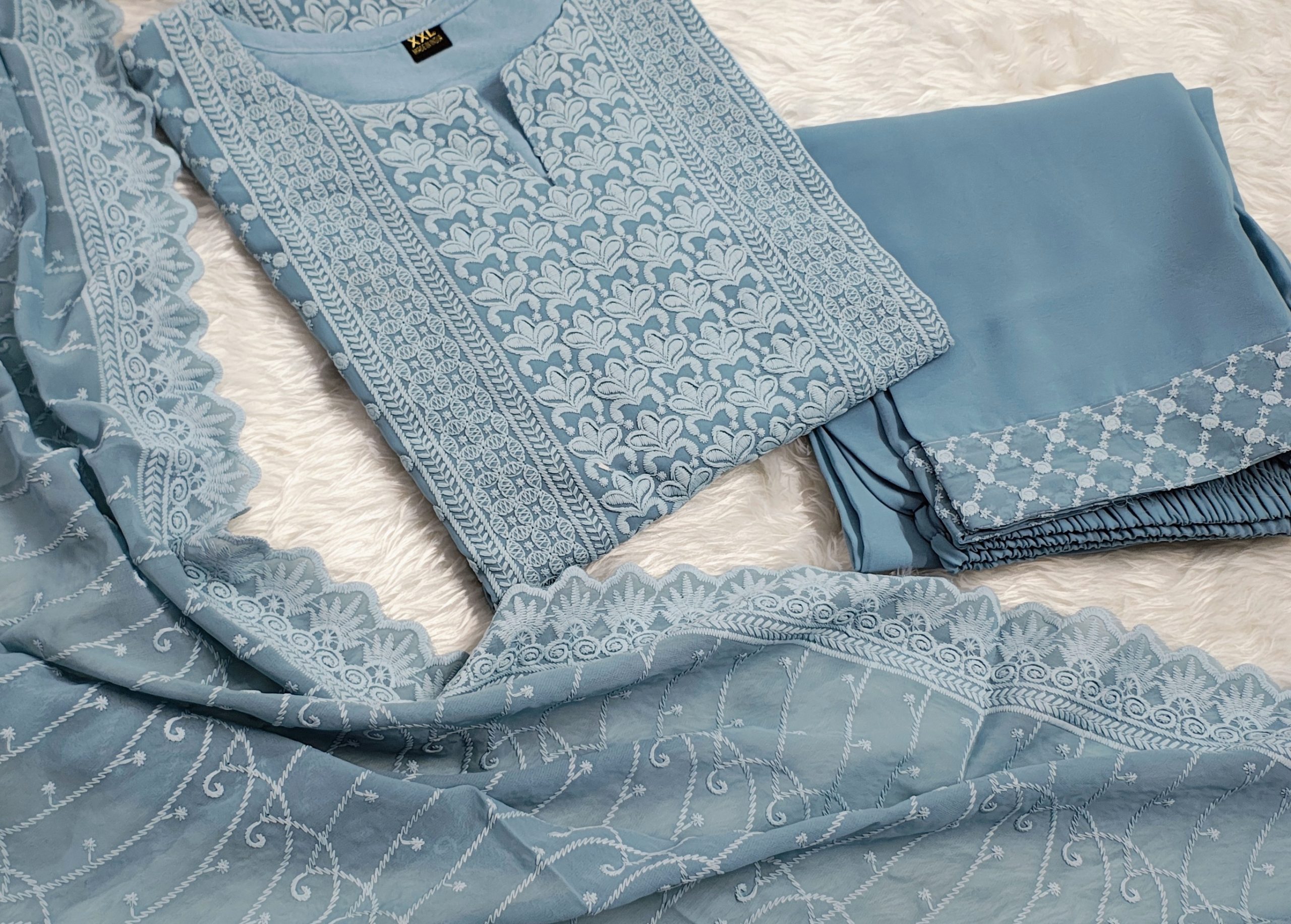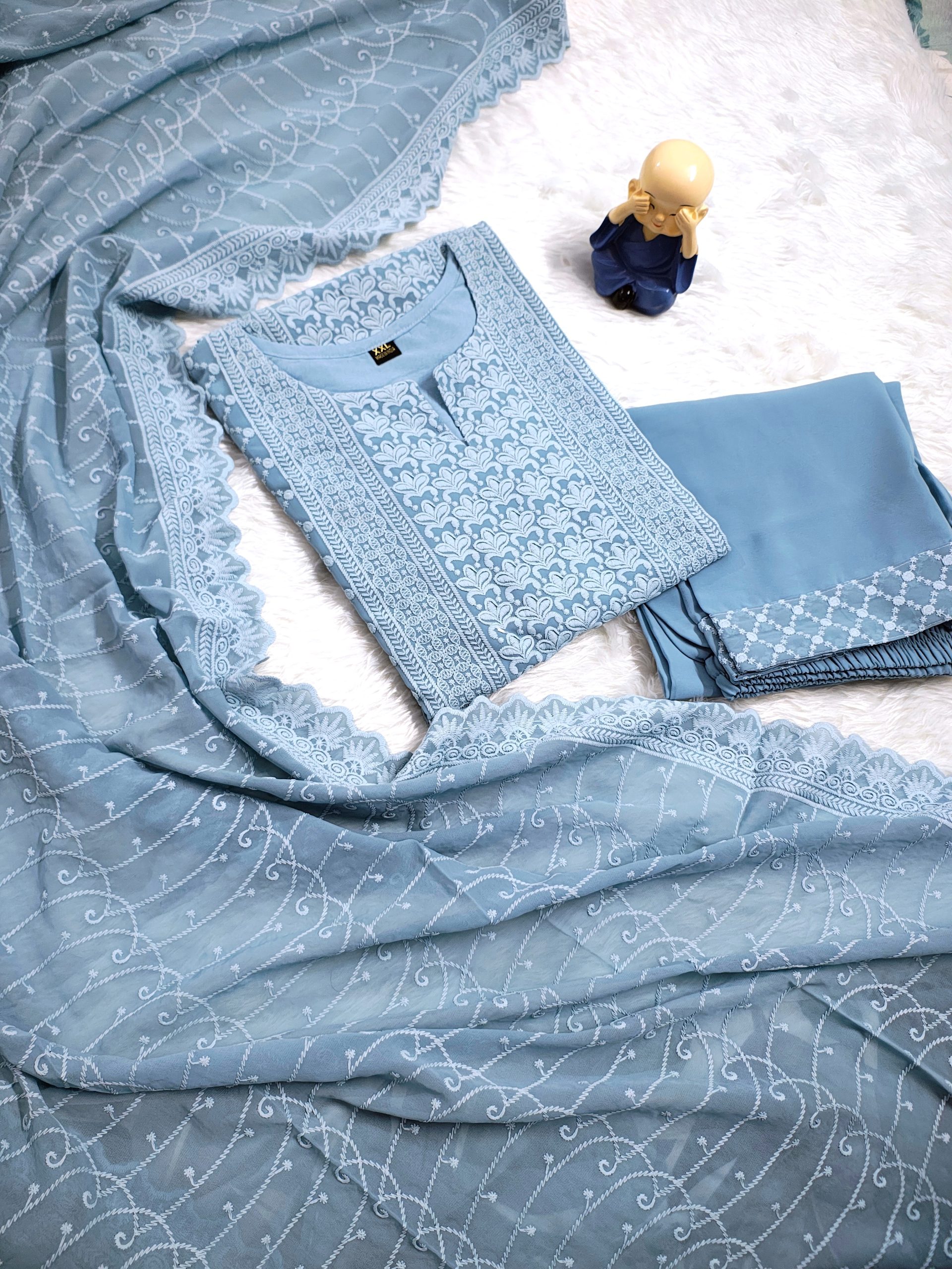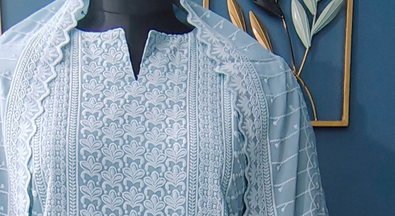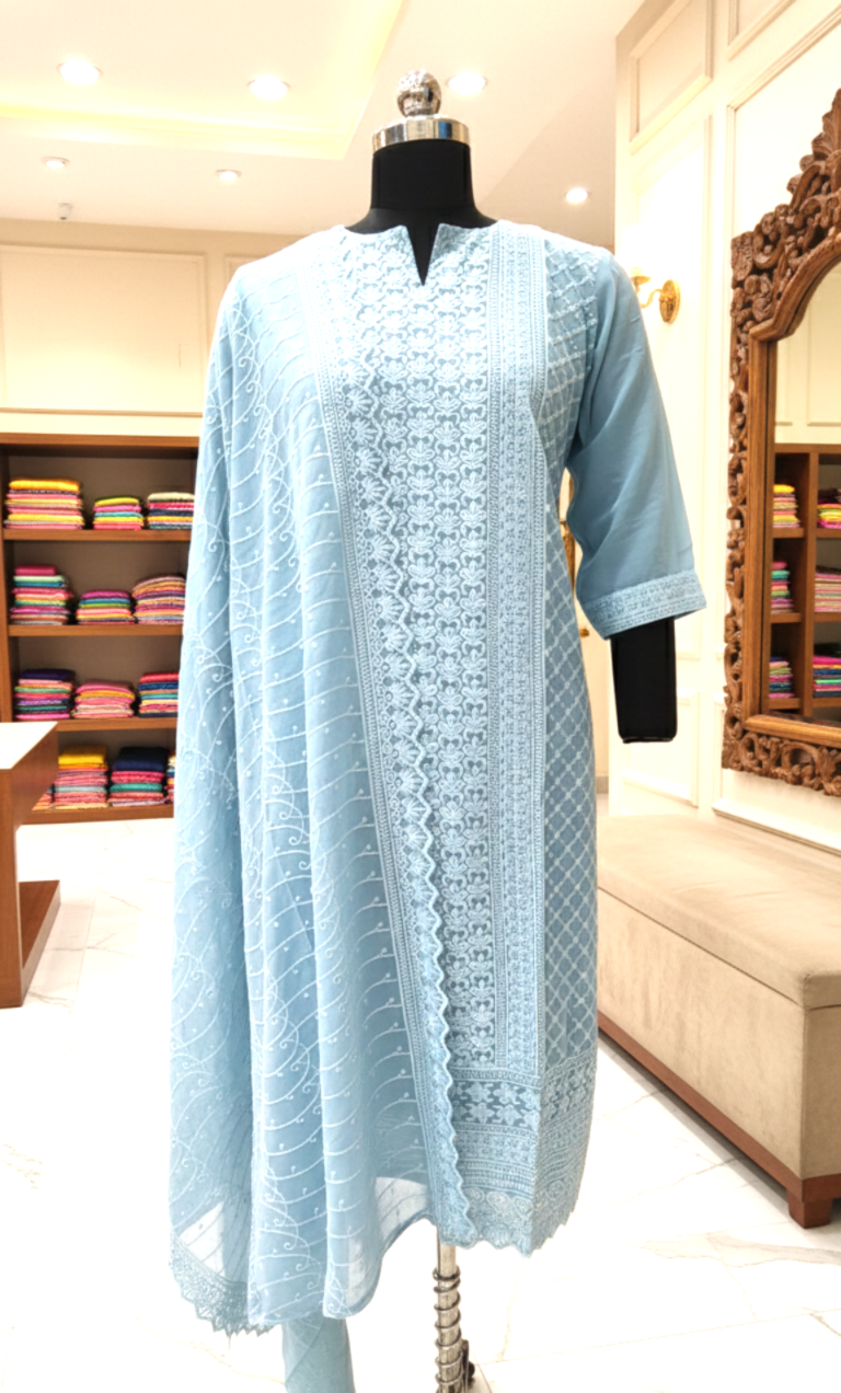 Experience timeless elegance with this Blue Georgette Chikankari Straight Kurta Set, crafted to reflect classic craftsmanship and graceful comfort. Made from lightweight and flowy georgette fabric, the kurta drapes beautifully, offering a soft and airy feel ideal for all-day wear.