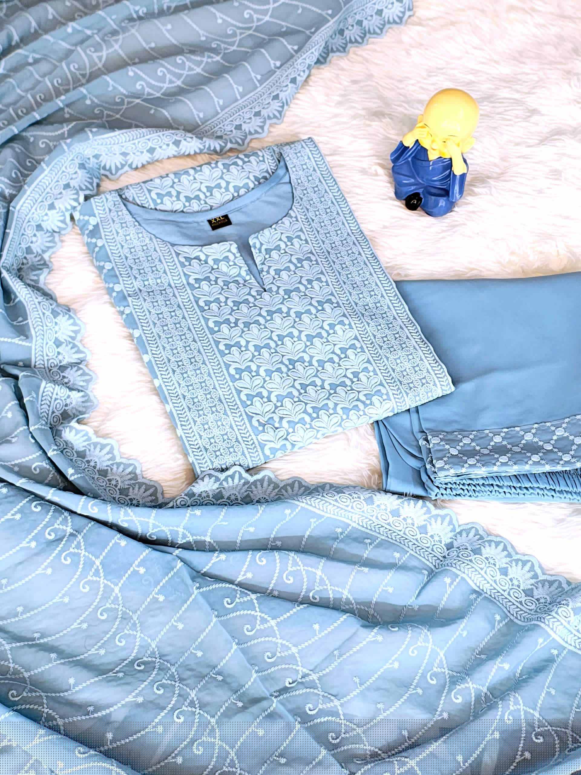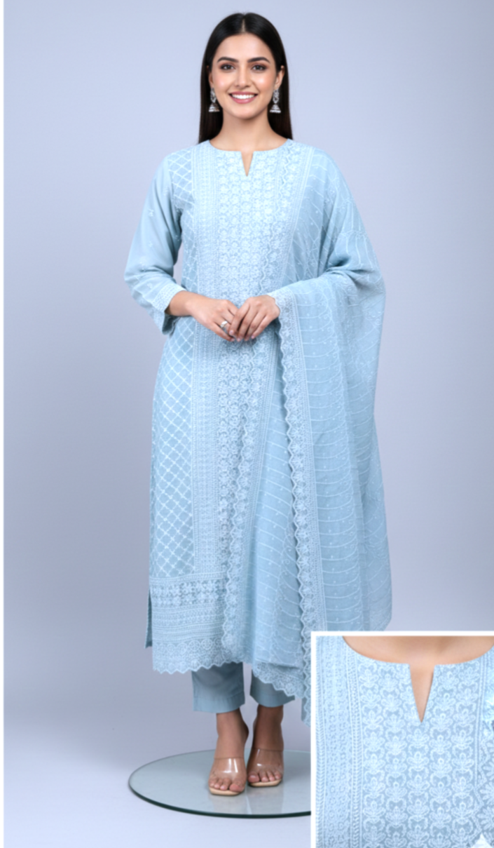 The kurta features exquisite Chikankari embroidery, adding delicate texture and traditional charm to the serene blue base. The straight-cut silhouette provides a flattering and versatile fit, suitable for both casual and festive occasions. Paired with a comfortable matching pant and a coordinated dupatta, this ensemble creates a refined and effortlessly elegant ethnic look.
