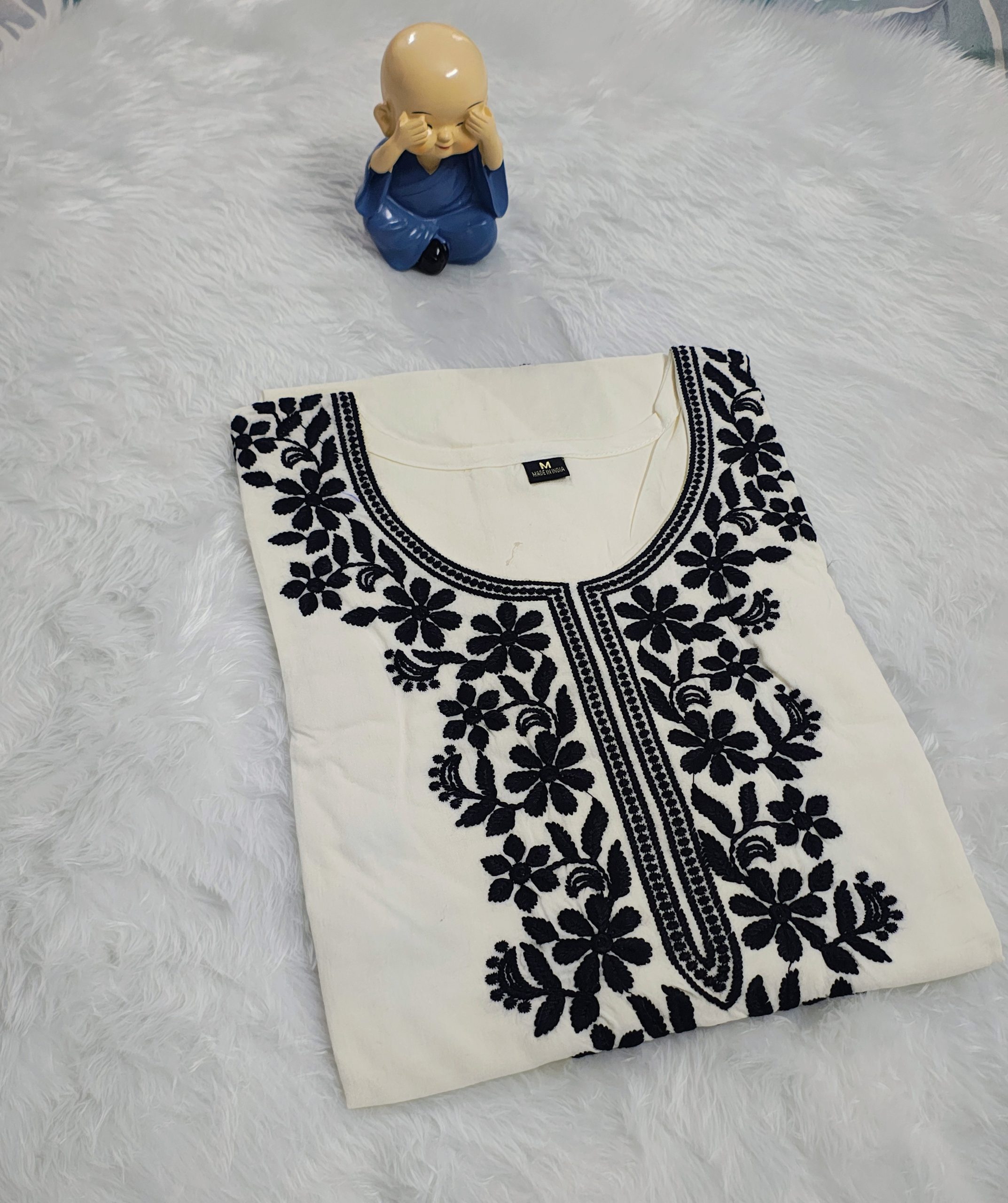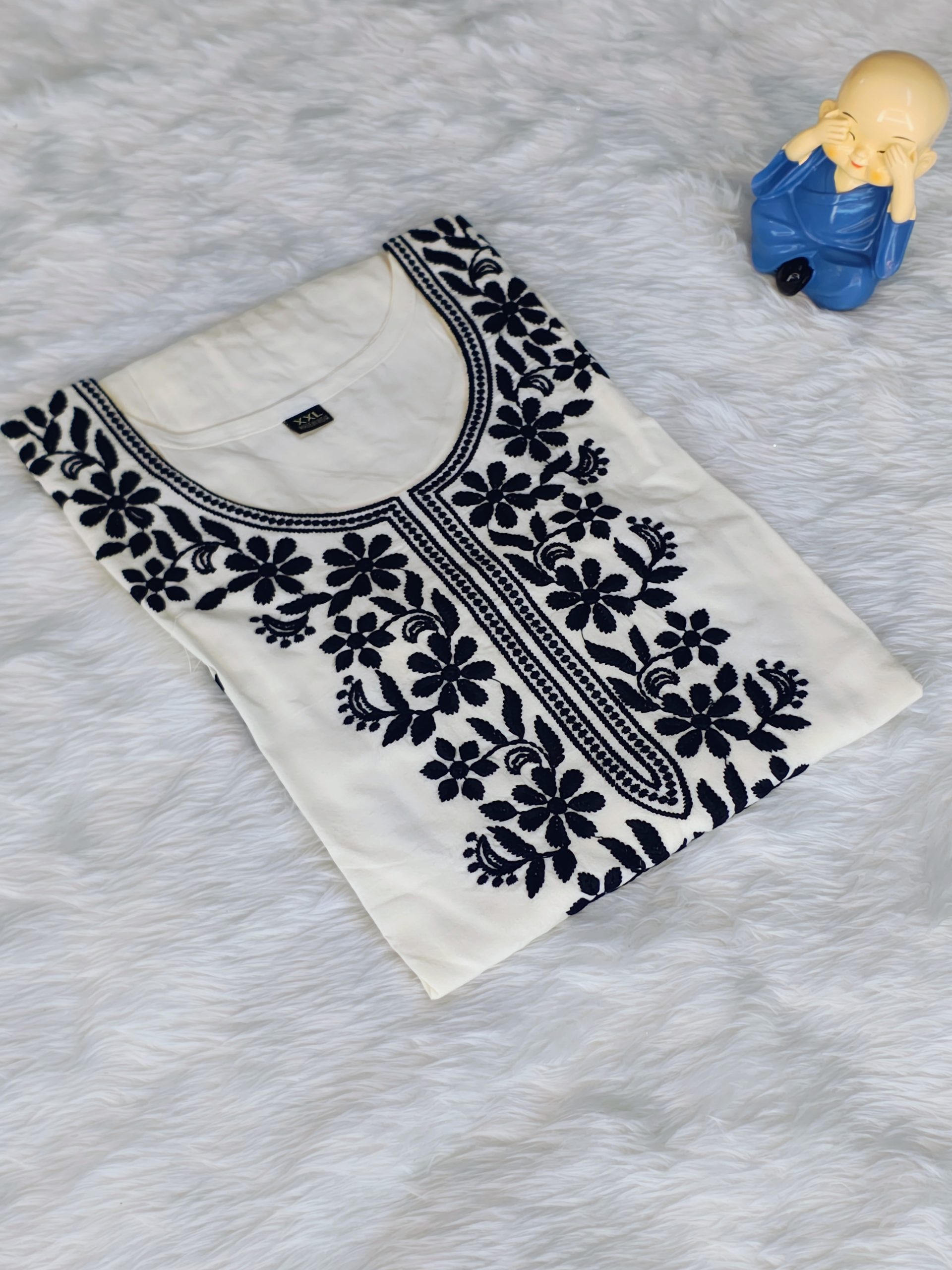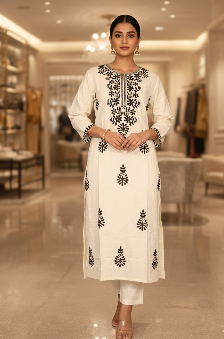 The kurta features delicate Chikankari embroidery, adding a refined handcrafted touch that beautifully contrasts with the classic off-white and black colour combination. The straight-cut silhouette ensures a flattering fit while allowing ease of movement. Versatile and stylish, this kurta is perfect for office wear, casual outings, and relaxed festive occasions.