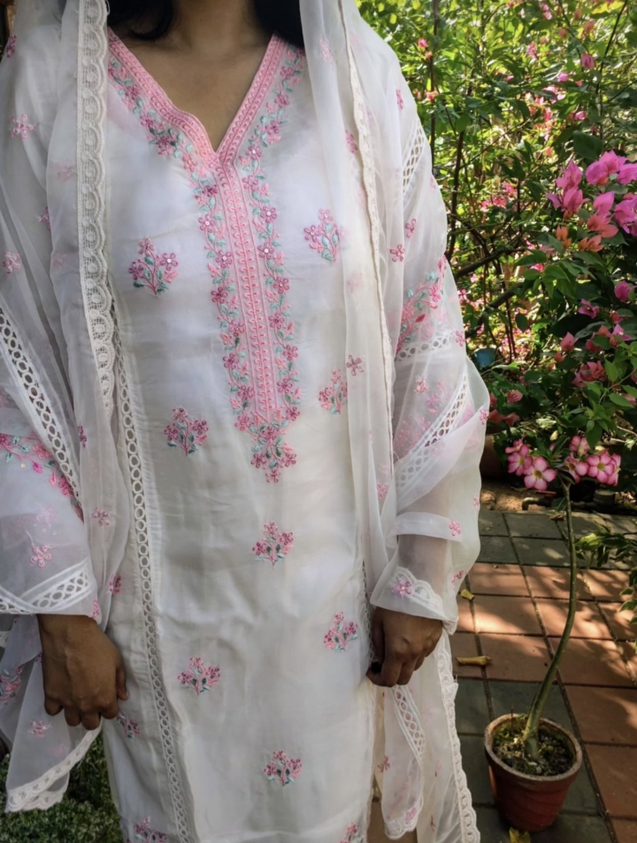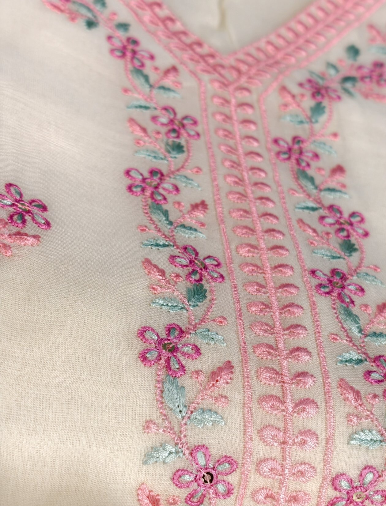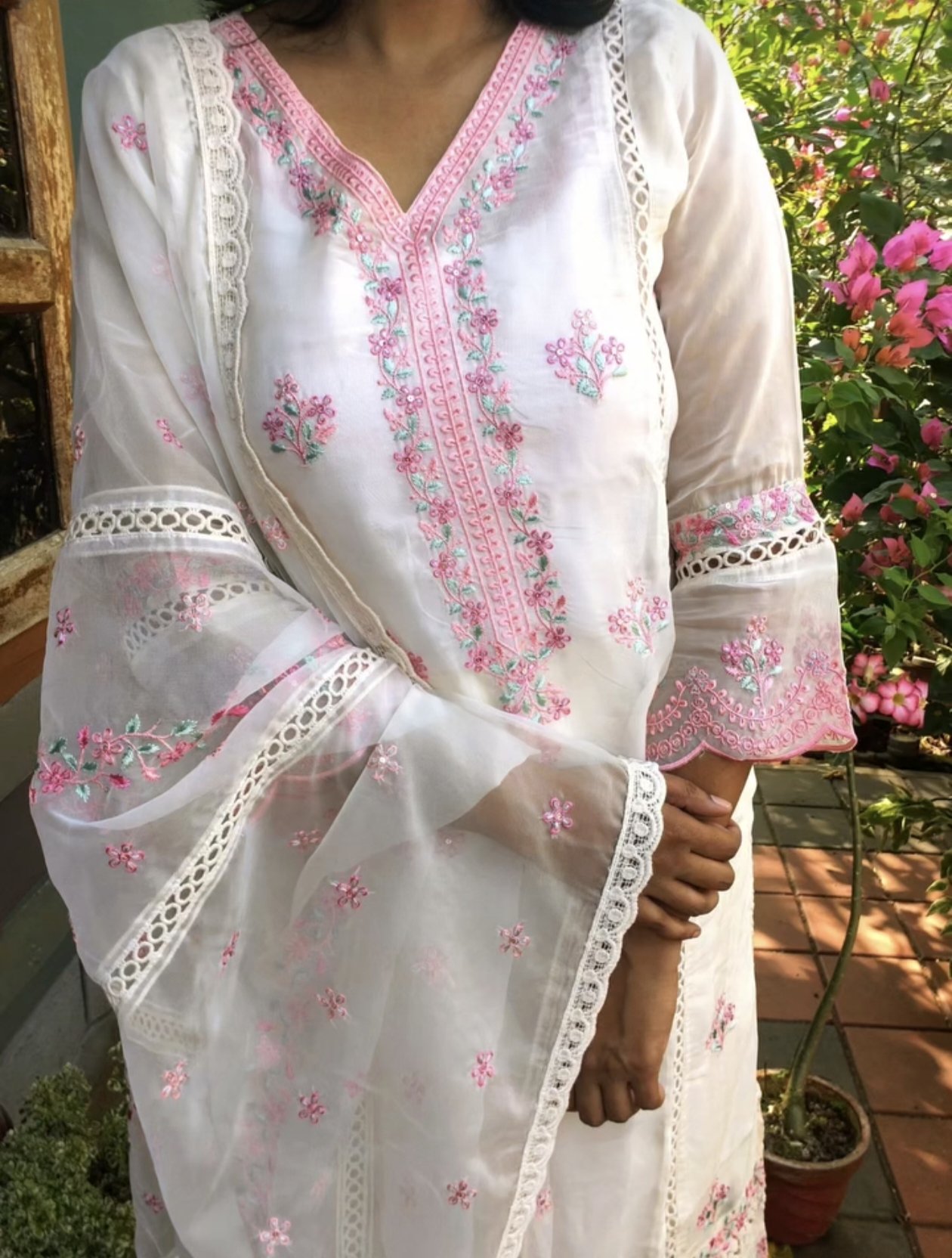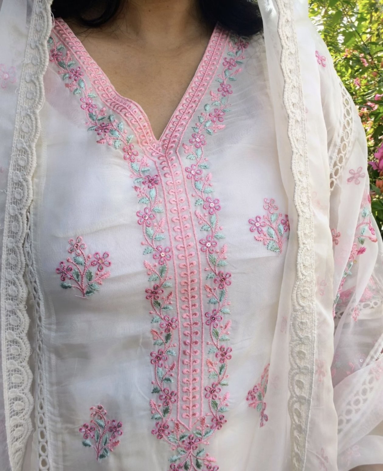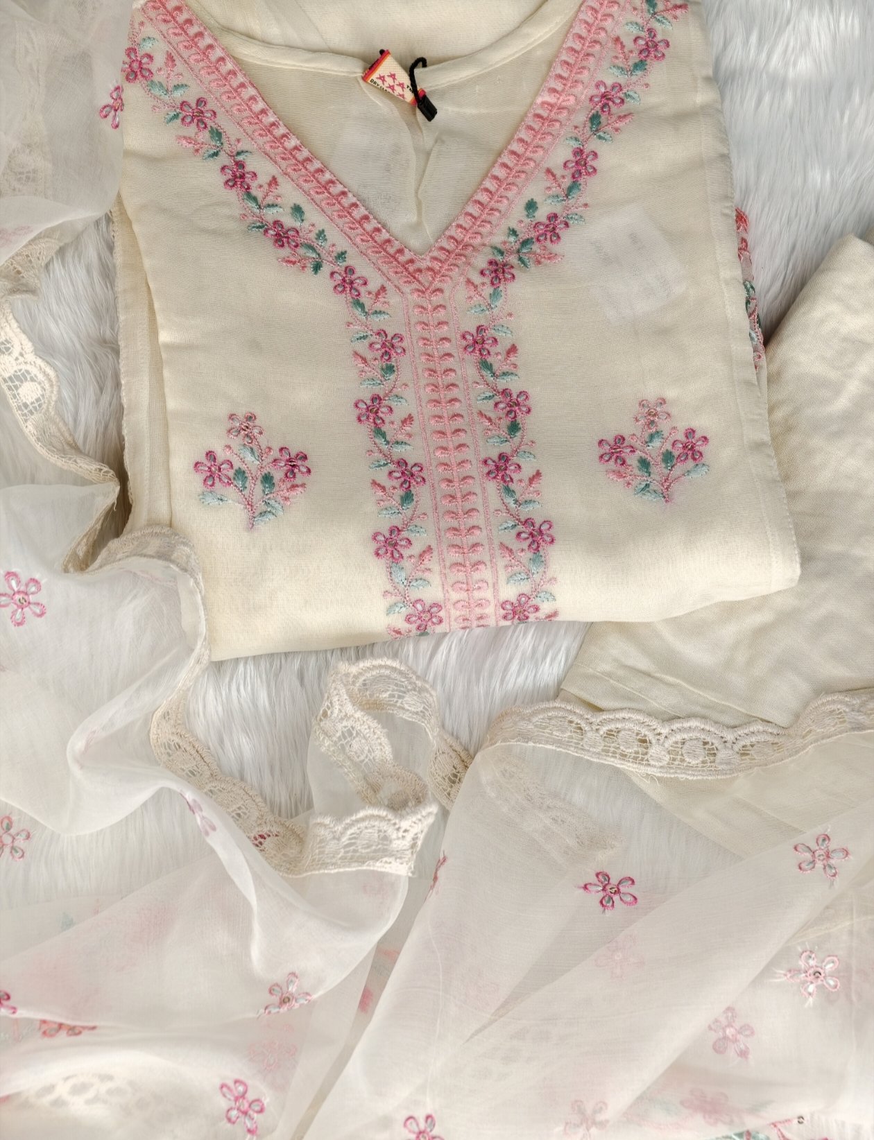 Delicate pink embroidery beautifully contrasts the off-white base, adding a touch of feminine charm and handcrafted elegance. The intricate detailing enhances the kurta without overwhelming its minimal appeal. Paired with a coordinated pant for comfort and a matching dupatta to complete the ensemble, this set blends contemporary style with timeless ethnic aesthetics.
