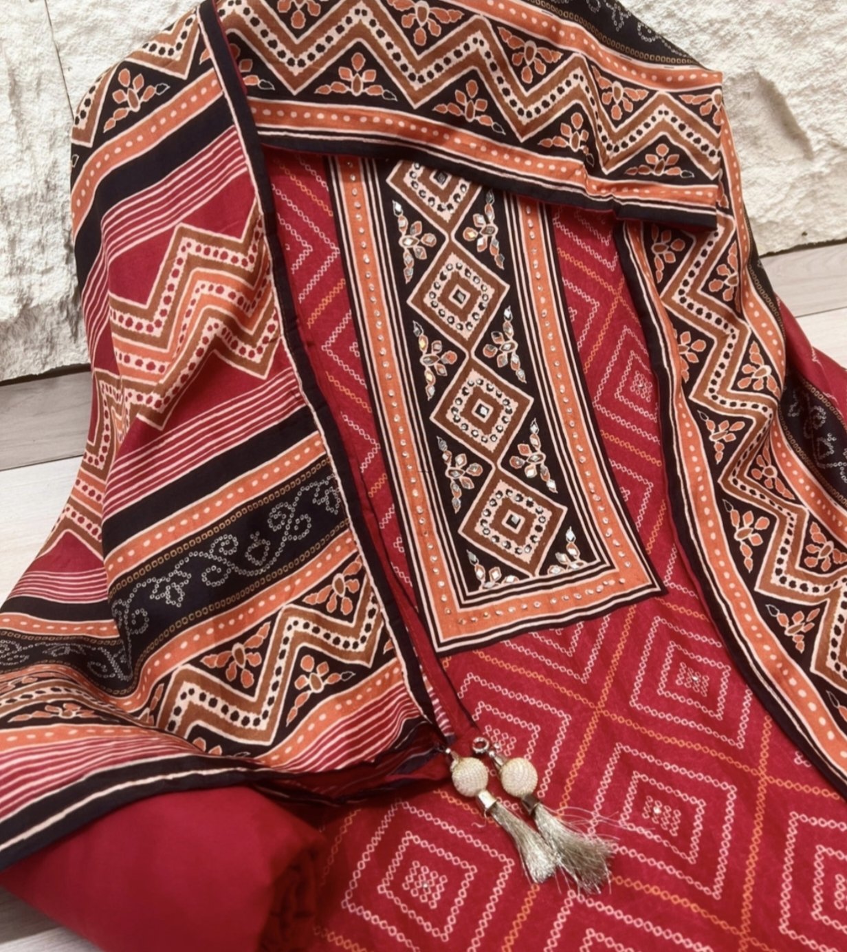 The kurta is adorned with delicate mirror work detailing, adding a hint of sparkle and traditional artistry against the deep maroon base. The straight silhouette ensures a flattering and comfortable fit, making it suitable for long hours of wear. Paired with a matching pant and a coordinated dupatta, this ensemble creates a polished and graceful ethnic look.
