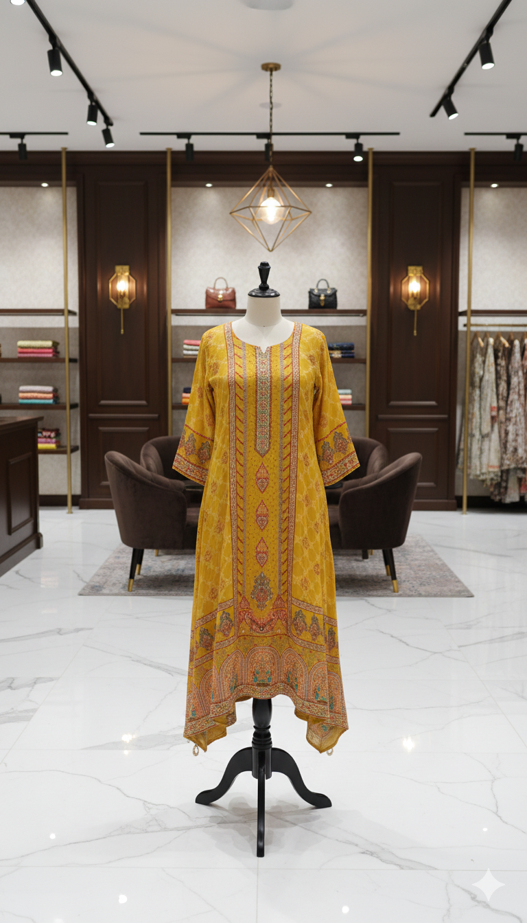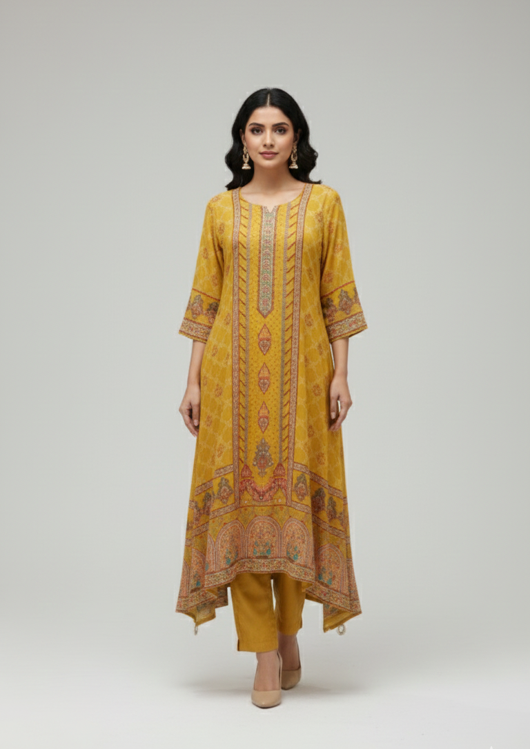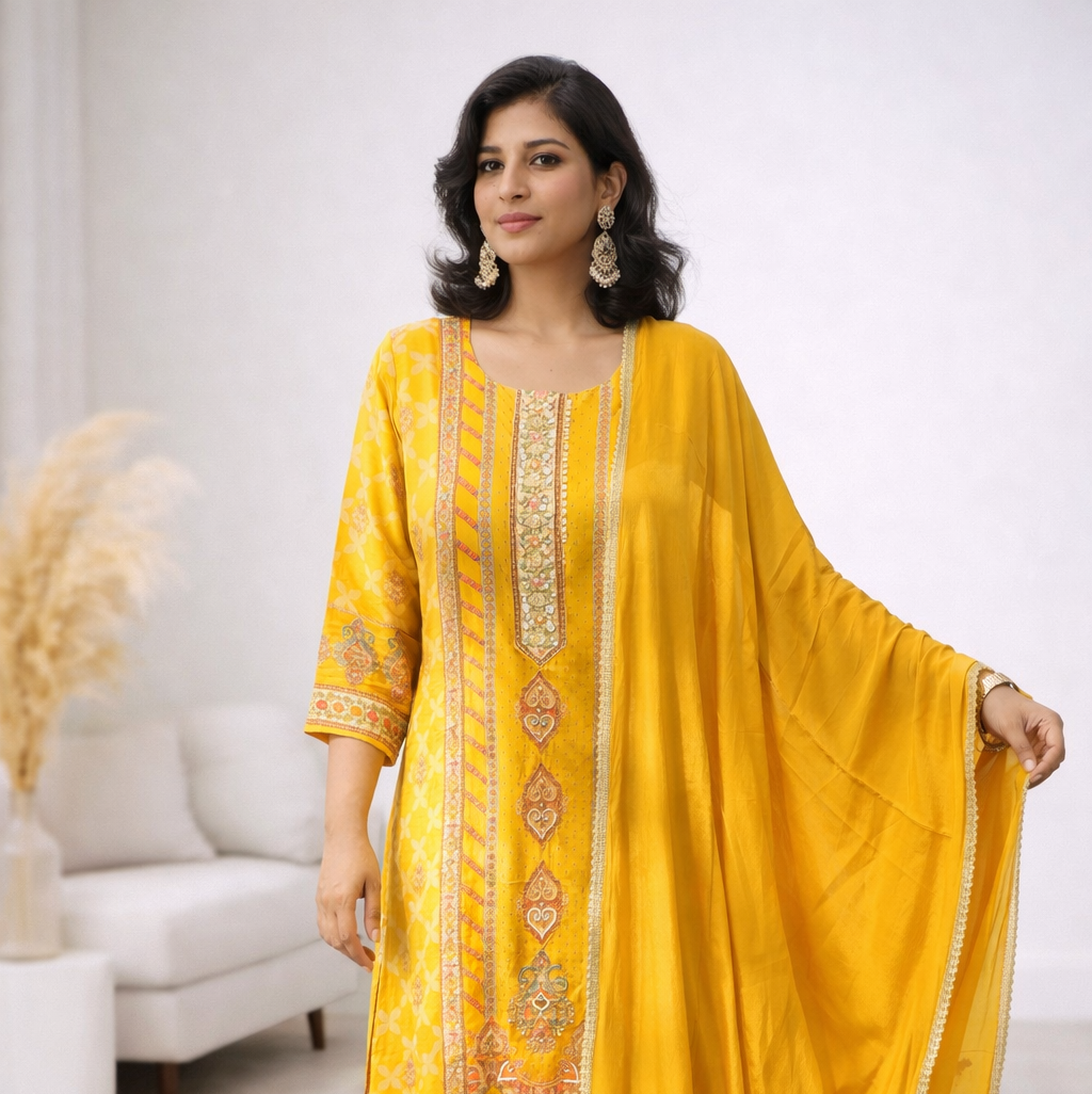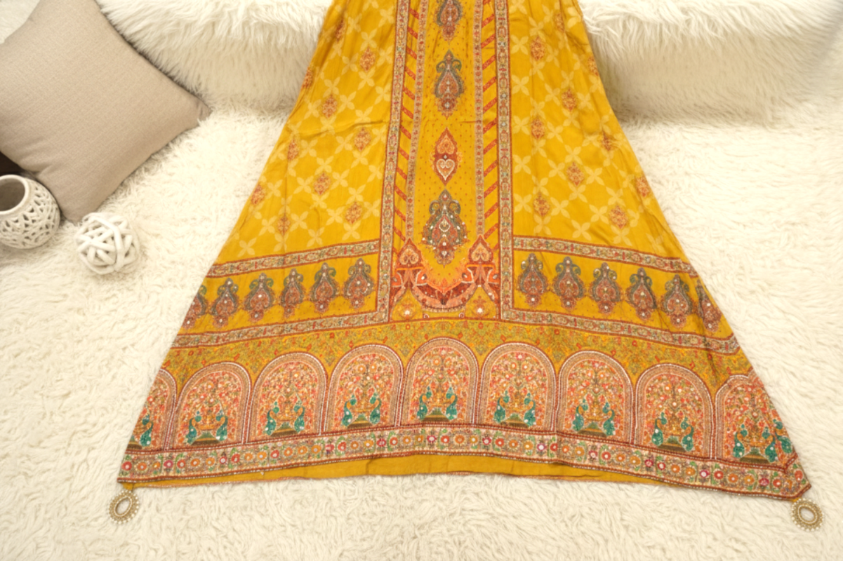 Brighten your ethnic wardrobe with this Mustard Yellow Mul Crepe Beaded Anarkali Kurta Set, designed to offer timeless elegance and graceful movement. Crafted from soft and lightweight mul crepe fabric, the Anarkali kurta drapes beautifully, creating a flattering flared silhouette that enhances every step.
