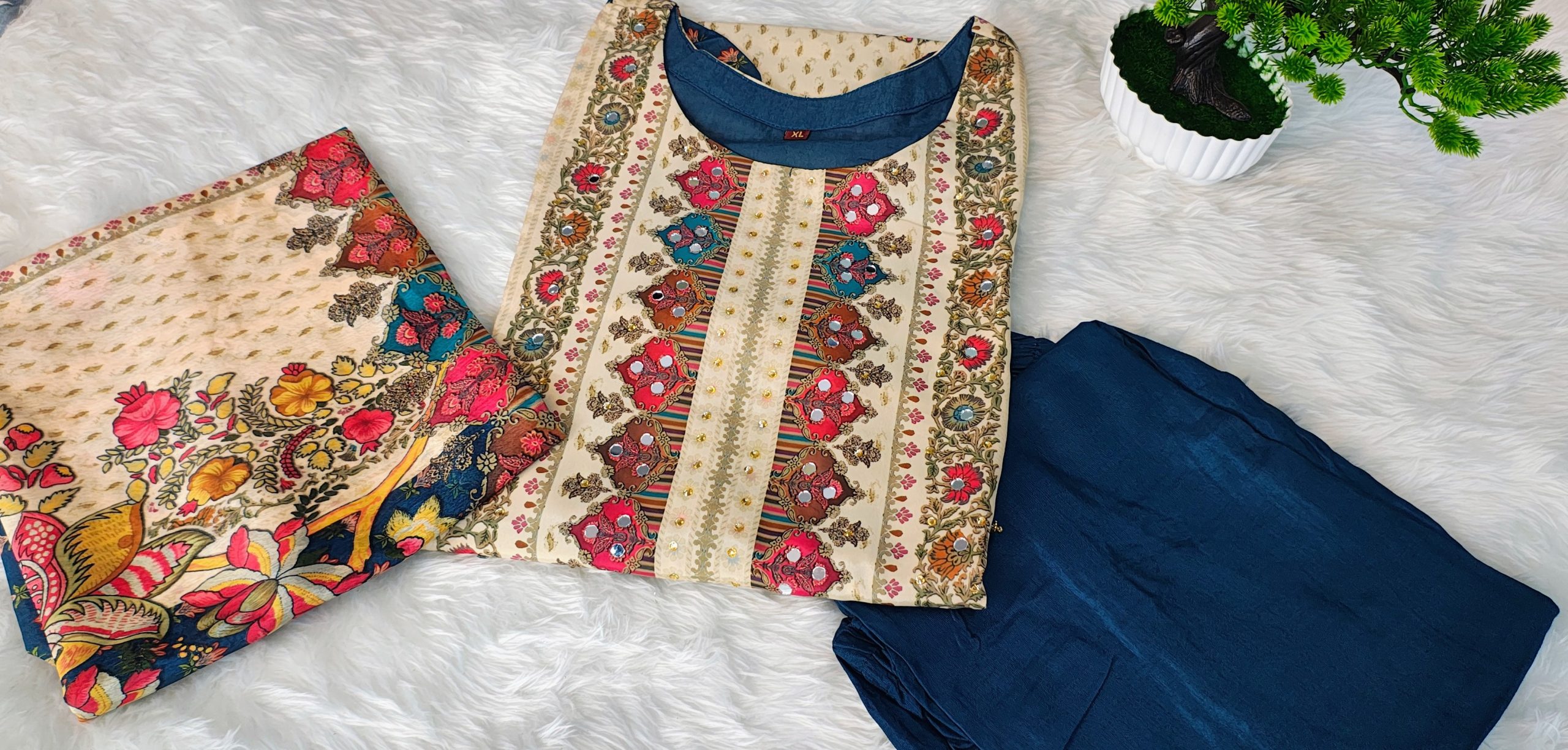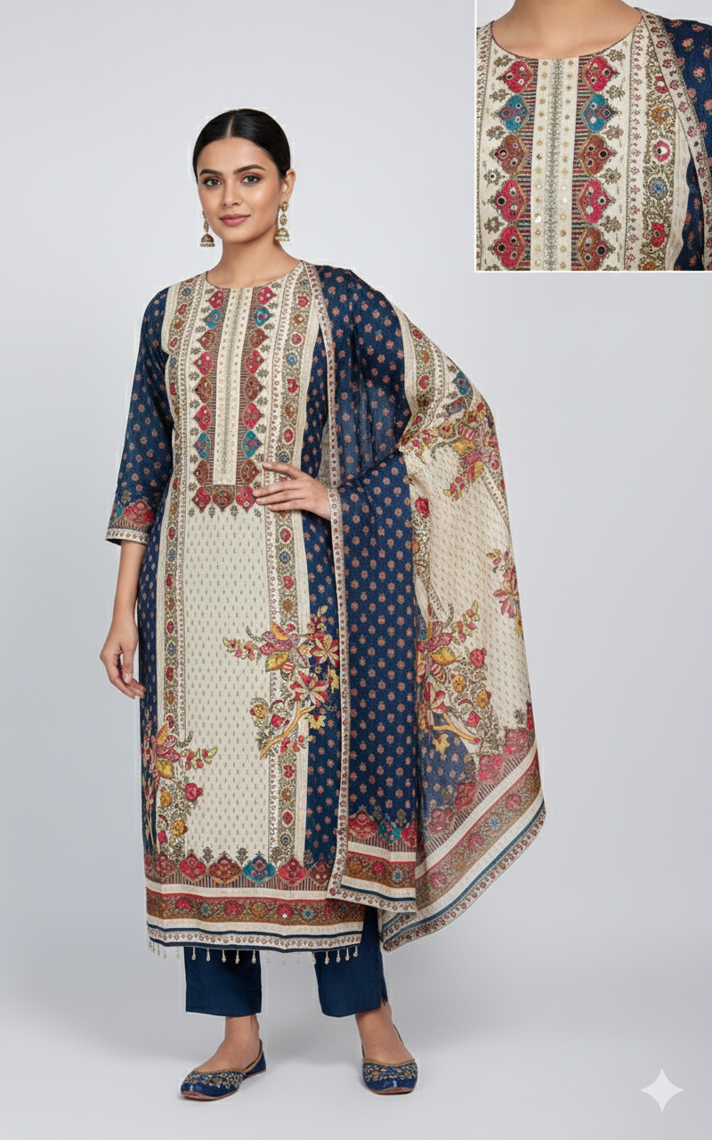 Add a touch of refined elegance to your ethnic wardrobe with this Navy Blue & Beige Panelled Poly Crepe Straight Kurta Set. Crafted from smooth and lightweight poly crepe fabric, the kurta showcases a beautiful contrast of navy blue with beige panels, enhanced by delicate mirror work detailing that adds subtle shine without overpowering the look.