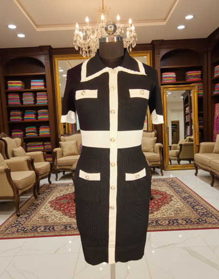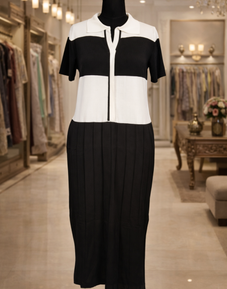 Elegant black and white collared midi dress with a timeless design. Perfect for office wear, brunch outings, and semi-formal occasions.