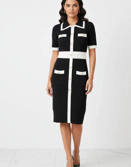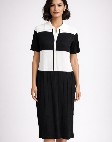 Black & White Collared Midi Dress – Elegant Women’s Classic Wear